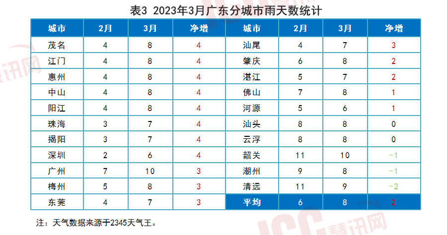 3月廣東平均降水天氣為8天,比上月多2天。各城市雨水天氣除韶關、清遠和潮州較上月有減少1-2天,汕頭和云浮與上月持平,其余16城雨水天數比上月均增加1-4天,其中有8城雨水天比上月增加4天。3月廣東砂石開工率有所下降。