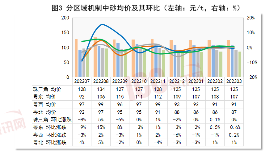 3月份成功調研砂樣本量241個。以中砂為例,機制砂106元/t,環(huán)比上漲0.6%;海砂143元/t,環(huán)比上漲2.1%;河砂146元/t,環(huán)比上漲2.1%。