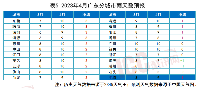 天氣預測看,4月整體比3月雨水天平均增加1天。其中有15城同比上月雨水天增加1-3天,廣州、韶關、湛江三市雨水天與3月持平,其他城市雨水天均同比減少1-3天。此外預測汽油、柴油價格在4月將有所下調,整體來看砂石的生產、運輸成本預計小幅減小。