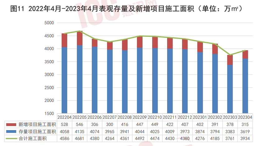 2023年4月表觀存量項目施工面積約3619萬㎡,近半年月均新增項目施工面積約315萬㎡,預計2023年4月總施工面積約3934萬㎡,整體高于2023年3月。