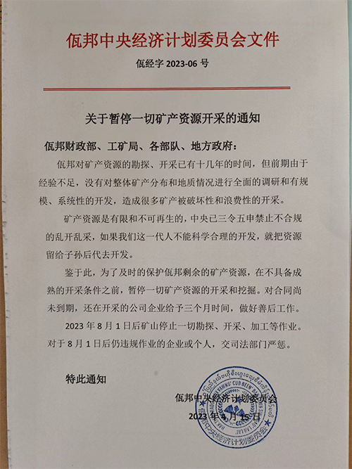 佤邦中央經(jīng)濟計劃委員會4月15日發(fā)布通知,為了保護剩余的礦產(chǎn)資源,在不具備成熟的開采條件之前,佤邦暫停一切礦產(chǎn)資源的開采和挖掘。對合同尚未到期,還在開采的公司企業(yè)給予三個月時間,將于2023年8月1日后停止一切勘探、開采和加工等作業(yè)。