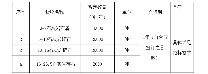 2. 項(xiàng)目名稱(chēng):松陽(yáng)縣華順交通投資有限公司、浙江暢陽(yáng)交通科技有限公司石灰?guī)r碎石、水泥混凝土原材料機(jī)制砂、碎石采購(gòu)項(xiàng)目(非政府采購(gòu)項(xiàng)目)3. 采購(gòu)方式:公開(kāi)招標(biāo)