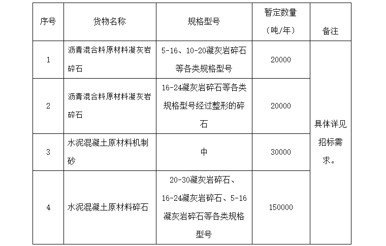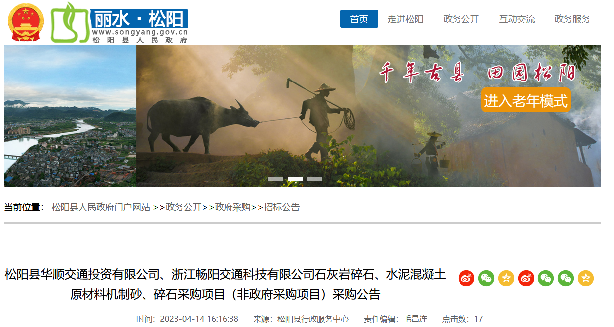 近日,浙江麗水市松陽(yáng)縣人民政府發(fā)布松陽(yáng)縣華順交通投資有限公司、浙江暢陽(yáng)交通科技有限公司石灰?guī)r碎石、水泥混凝士原材料機(jī)制砂、碎石采購(gòu)項(xiàng)目 (非政府采購(gòu)項(xiàng)目) 采購(gòu)公告,每年共計(jì)28.2萬(wàn)噸砂石。