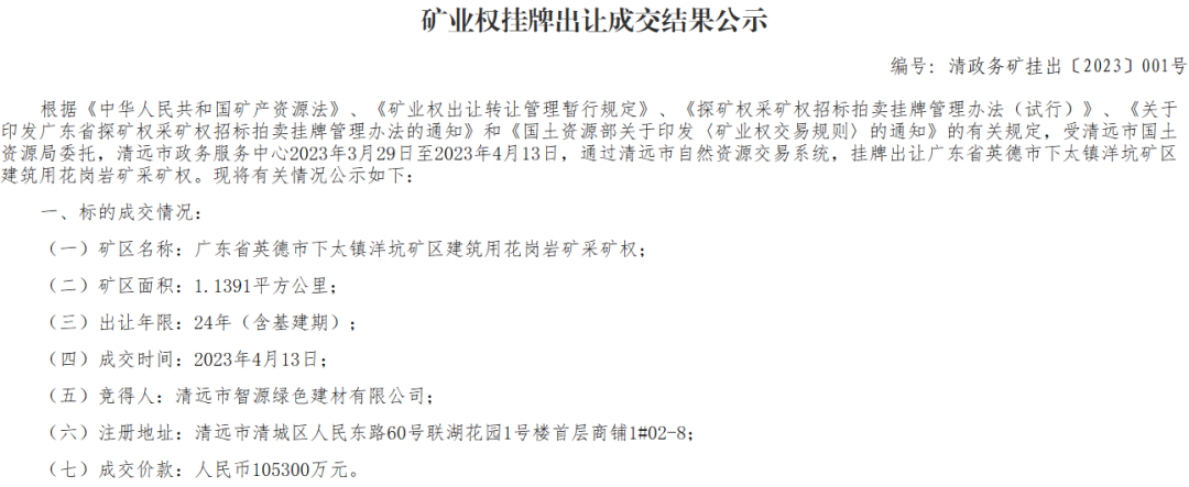 近日,廣東清遠(yuǎn)市公共資源交易中心成功競(jìng)出廣東省英德市下太鎮(zhèn)洋坑礦區(qū)建筑用花崗巖礦采礦權(quán)。該礦區(qū)位于英德市下太鎮(zhèn),礦區(qū)面積1.1391平方公里(1708畝),起始價(jià)10.5億元,最終競(jìng)得人為清遠(yuǎn)市智源綠色建材有限公司,成交價(jià)為10.53億元。