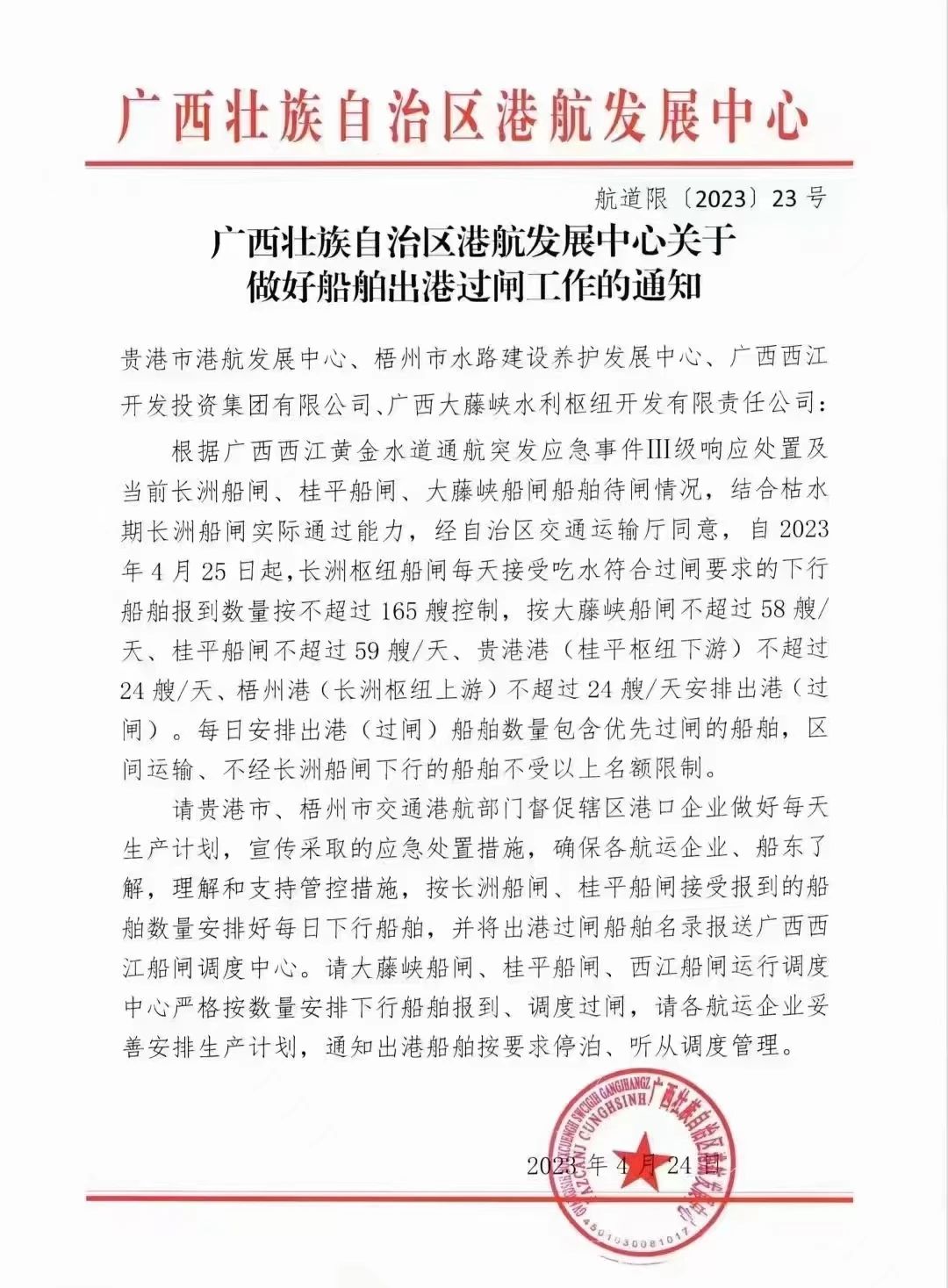 今日,廣西壯族自治區(qū)港航發(fā)展中心關(guān)于做好船舶出港過閘工作的通知。根據(jù)通知內(nèi)容,根據(jù)廣西西江黃金水道通航突發(fā)應(yīng)急事件II級響應(yīng)處置及當(dāng)前長洲船閘、桂平船閘、大藤峽船閘船舶待閘情況,結(jié)合枯水期長洲船閘實際通過能力,經(jīng)自治區(qū)交通運輸廳同意,自2023年4月25日起: