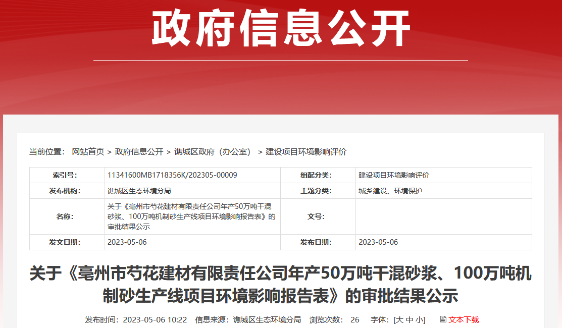 關于《亳州市芍花建材有限責任公司年產50萬噸干混砂漿、100萬噸機制砂生產線項目環(huán)境影響報告表》的審批結果公示2023年5月6日,《亳州市芍花建材有限責任公司年產50萬噸干混砂漿、100萬噸機制砂生產線項目環(huán)境影響報告表》通過環(huán)評審批,現(xiàn)審批結果有關情況公示如下: