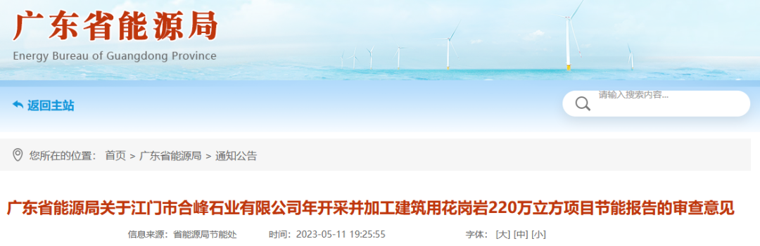 廣東省能源局關(guān)于江門市合峰石業(yè)有限公司年開采并加工建筑用花崗巖220萬(wàn)立方項(xiàng)目
