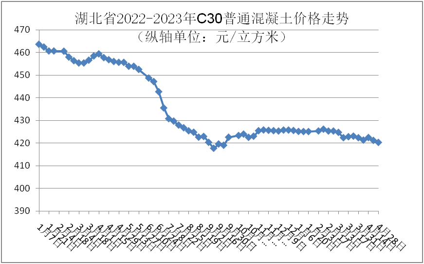 監(jiān)測(cè)數(shù)據(jù)顯示:4月份,強(qiáng)度等級(jí)C30普通混凝土全省均價(jià)為421.24元/立方米,環(huán)比下跌0.42%,同比下跌7.84%。