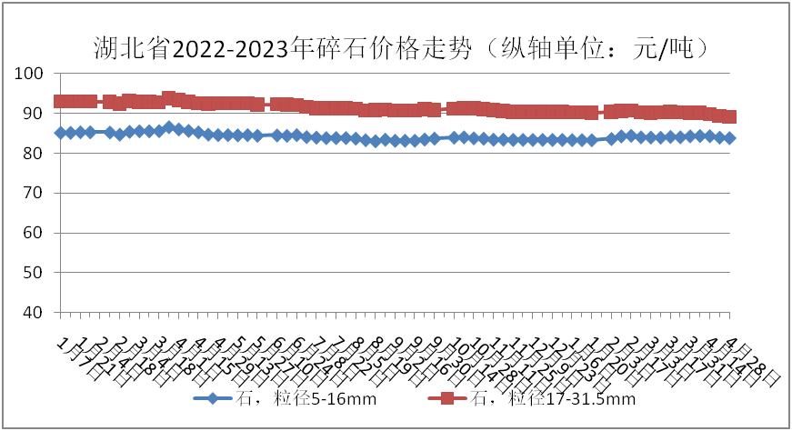 監(jiān)測(cè)數(shù)據(jù)顯示:4月份,碎石(粒徑5-16mm)、碎石(粒徑17-31.5mm)全省均價(jià)分別為84.20元/噸、89.62元/噸,環(huán)比上漲0.05%和下跌0.68%;同比分別下跌:1.32%和3.40%。具體價(jià)格走勢(shì)情況如下圖: