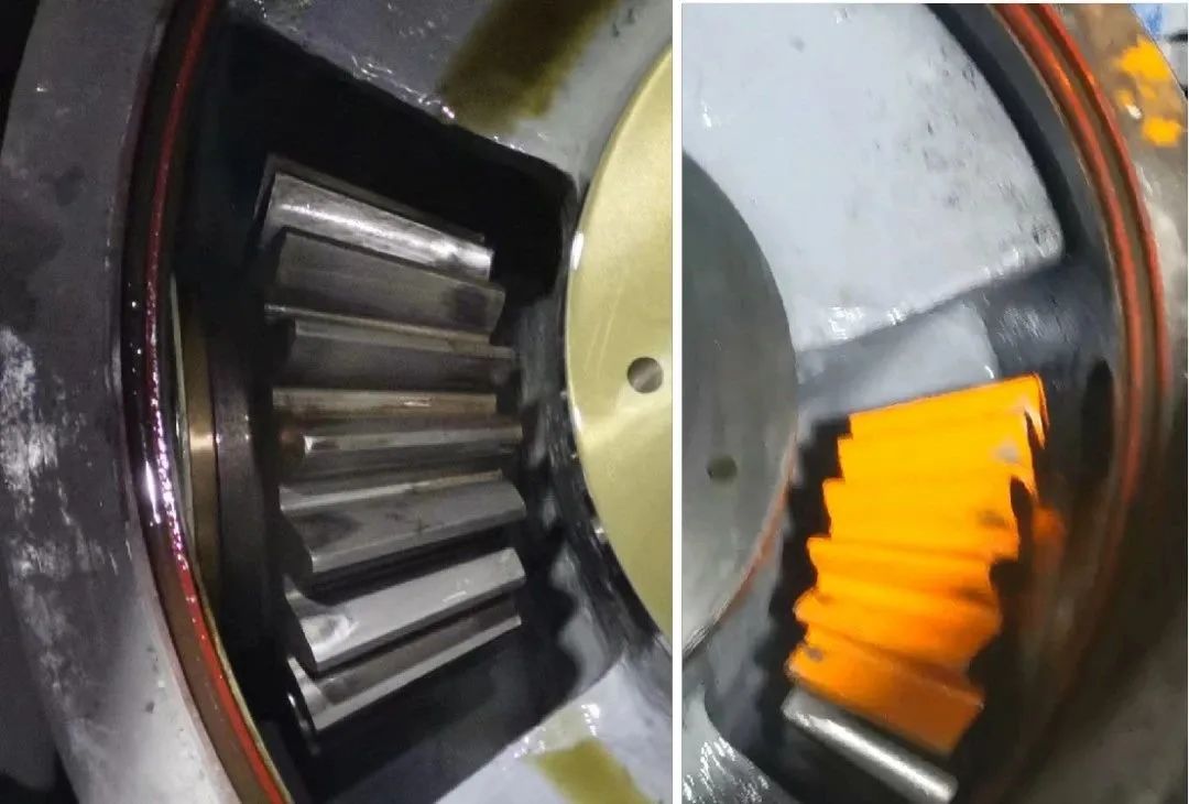 大小齒輪嚙合面,磨損不均勻(現(xiàn)場出現(xiàn)齒輪卡死情況,更換小齒輪后,有改善);潤滑壓力波動較大(200-318kpa);