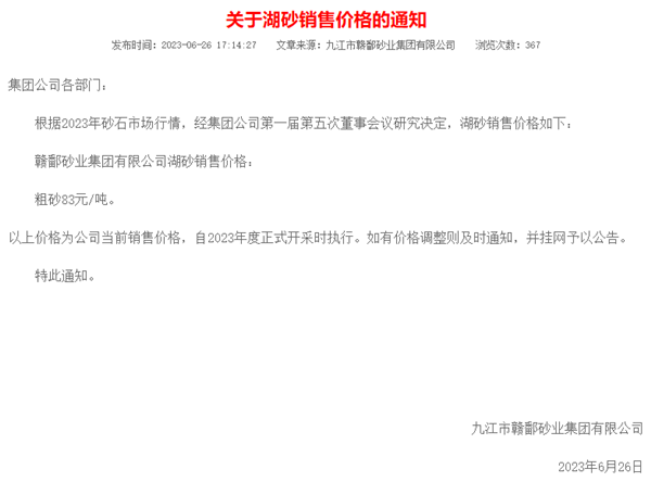 6月26日,江西省九江市贛鄱砂業(yè)集團(tuán)有限公司根據(jù)2023年砂石市場(chǎng)行情,將其湖砂銷售價(jià)格調(diào)整為粗砂83元/噸,該價(jià)格自2023年度鄱陽湖砂正式開采時(shí)執(zhí)行。