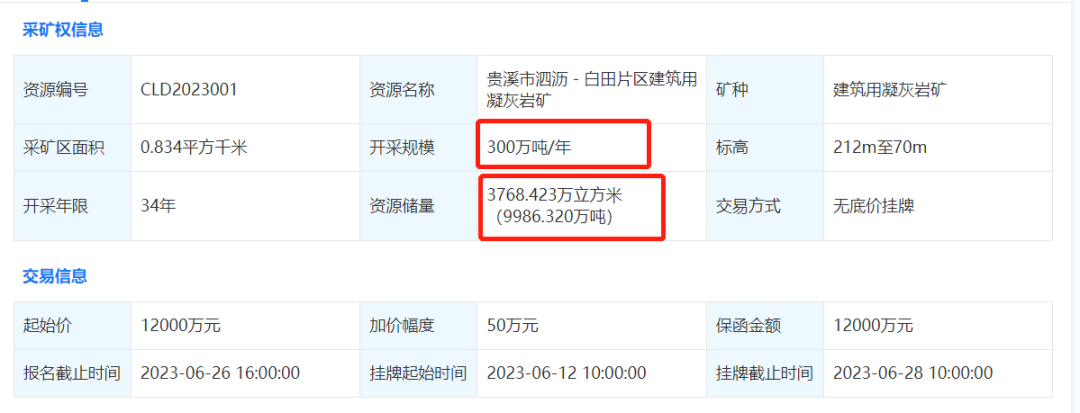 據(jù)悉,江西省公共資源交易平臺成功出讓貴溪市泗瀝-白田片區(qū)建筑用凝灰?guī)r礦采礦權(quán),貴溪市城市資源開發(fā)有限公司以1.2億成功競得。該礦資源儲量3768.423萬方(9986.32萬噸),該礦出讓34年,年產(chǎn)300萬噸。