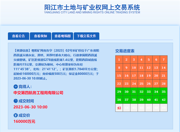 競得采礦權(quán)后,競得人須額外支付共計24億元相關(guān)費用。包括采礦權(quán)出讓前期綜合費用12億元;每年支付給陽西縣人民政府鄉(xiāng)村振興建設(shè)和社會維穩(wěn)幫扶資金200萬元(20年共4000萬元);每年支付給陽西縣溪頭鎮(zhèn)人民政府鄉(xiāng)村振興建設(shè)和社會維穩(wěn)幫扶資金300萬元(20年共6000萬元);生態(tài)補償金1億元;為保障石料運輸過程中礦區(qū)周邊居民出行安全問題以及解決礦產(chǎn)出運問題,競得人須出資10億元建設(shè)與礦區(qū)有關(guān)的配套設(shè)施及礦區(qū)周邊村莊相關(guān)的基礎(chǔ)設(shè)施項目(不包括用于礦山開采、生產(chǎn)銷售、運輸廊道及采礦權(quán)競得人生活配套等設(shè)施)。