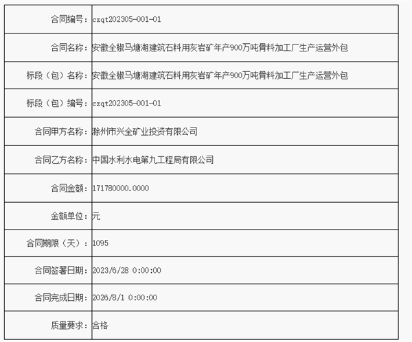 6月28日,安徽滁州興全礦業與水電九局簽署馬塘湖建筑石料用灰巖礦年產900萬噸骨料加工廠生產運營外包項目。該項目合同期限1095天,合同金額1.7億元,須在2026年8月1日完成。