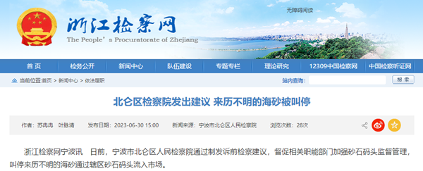 日前,浙江省寧波市北侖區人民檢察院通過制發訴前檢察建議,督促相關職能部門加強砂石碼頭監督管理,叫停來歷不明的海砂通過轄區砂石碼頭流入市場。