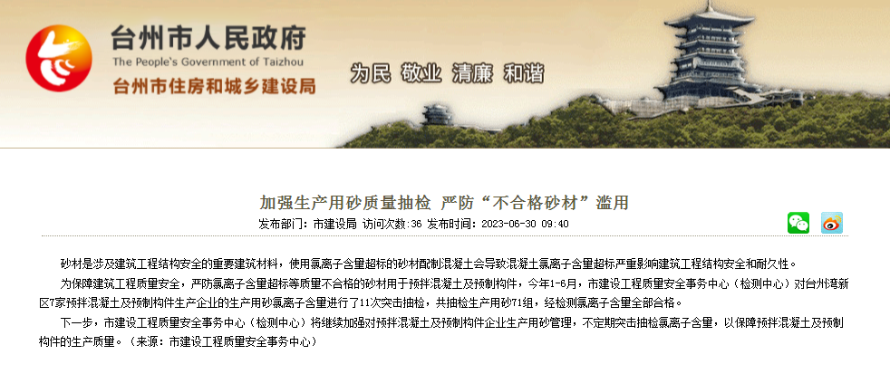 據了解,為保障建筑工程質量安全,嚴防氯離子含量超標等質量不合格的砂材用于預拌混凝土及預制構件。