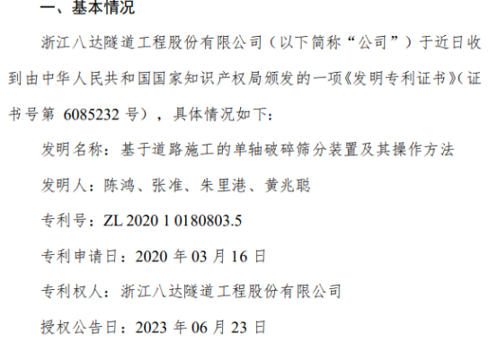 07月05日,浙江八達隧道工程股份有限公司發布公告稱,公司于近日收到由中華人民共和國國家知識產權局頒發的一項《發明專利證書》(證書號第 6085232 號),發明名稱為基于道路施工的單軸破碎篩分裝置及其操作方法。