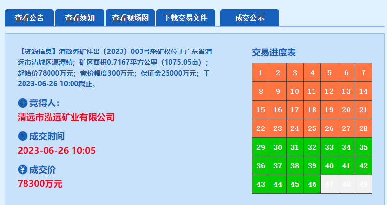 2023年6月26日,清遠市泓遠礦業有限公司以78300萬元競得廣東清遠市清城區源潭鎮青龍深木窿建筑用花崗巖礦。礦區范圍內,建筑用花崗巖礦資源儲量6974.84萬方,生產規模300萬方/年,出讓年限21年8個月(含基建期)。