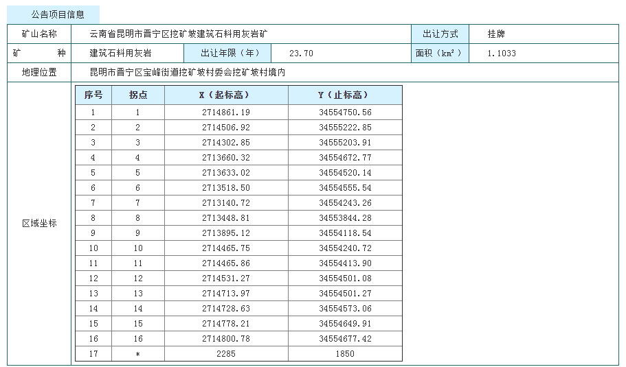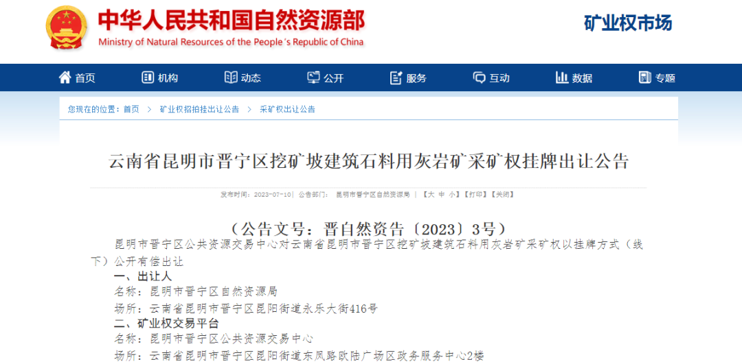 7月7日,昆明市晉寧區(qū)自然資源局發(fā)布公告,掛牌出讓云南省昆明市晉寧區(qū)挖礦坡建筑石料用灰?guī)r礦采礦權,擬出讓23.74年(24年9個月),起始價14111.9萬元。