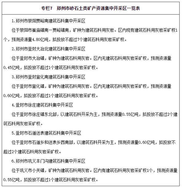 規劃期間,河南鄭州市建筑石料用灰巖年產礦石量控制在5600萬噸/年;劃分集中開采區6個,擬投放不超過14個建筑石料用灰巖采礦權,預測資源總儲量9.25億噸。