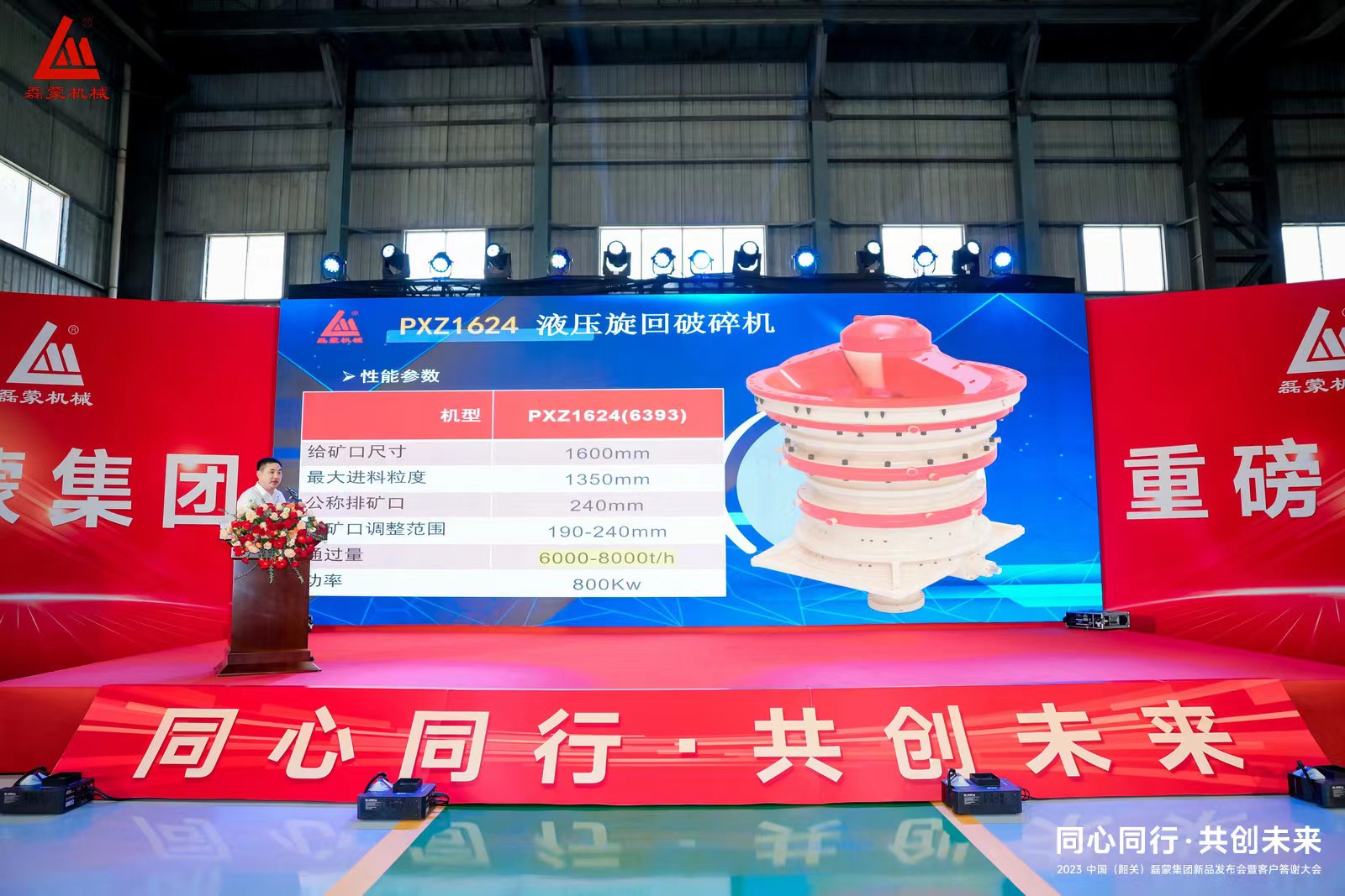 發(fā)布會(huì)現(xiàn)場(chǎng),董事長(zhǎng)張宏強(qiáng)的鄭重介紹了本次重磅推出的四大新品:大型主機(jī)——PXZ1624大型液壓旋回式破碎機(jī)、MBS3660濕式棒磨機(jī)、DH980/985單缸液壓圓錐式破碎機(jī)、PFG2023高性能反擊式破碎機(jī)。