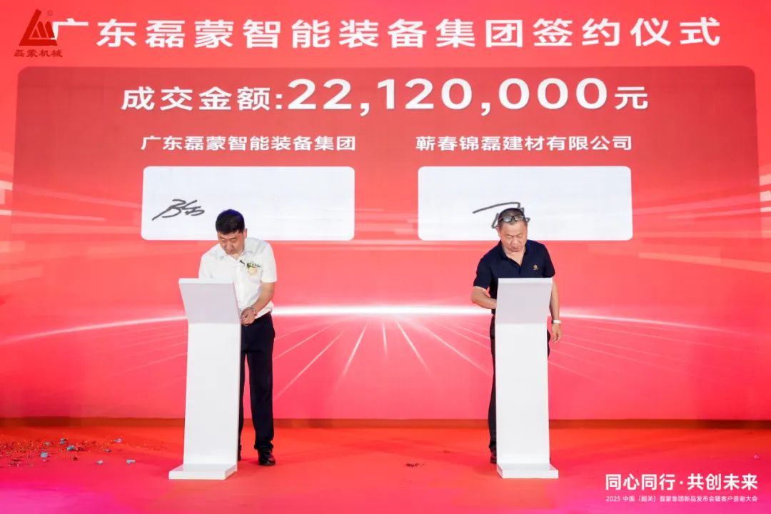 廣東磊蒙智能裝備集團(tuán)有限公司與蘄春錦磊建材有限公司簽約進(jìn)行現(xiàn)場(chǎng)簽約,成交金額:2212萬元。