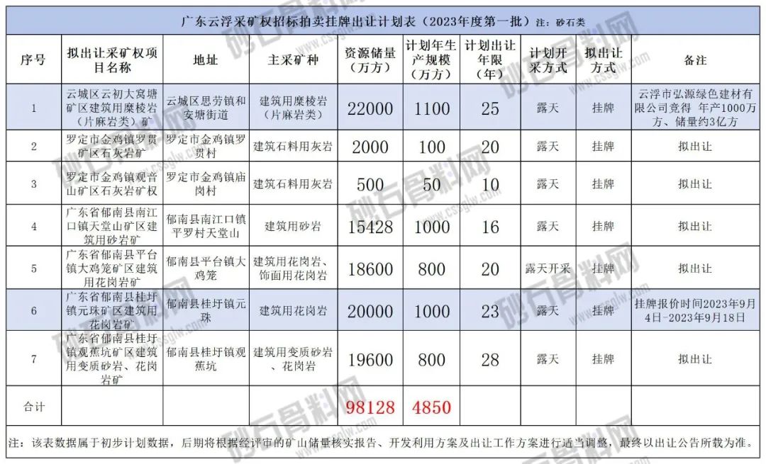 另據了解,根據廣東云浮2023年度第一批采礦權出讓計劃,今年云浮擬出讓7宗儲量約10億方、合計年產能4850萬方砂石采礦權。除已成功出讓大窩塘礦區砂石礦、加之此次掛牌出讓元珠礦區礦外,未來,廣東云浮還有5宗砂石大礦擬出讓,儲量約5.6億方、合計年產能2750萬方(下附礦權具體信息表)。
