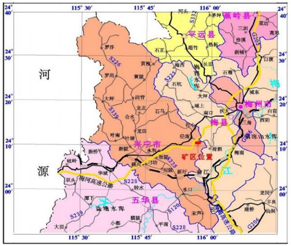 根據出讓評估報告,該礦位于興寧市城區北東87°方向、直線距離約30千米處,隸屬興寧市徑南鎮管轄。礦區范圍距縣道(X969線)約78米,向南約4千米接S226省道,距離興寧市城區30千米;距離梅州市區35千米,往南約500米接入G25高速可轉G78高速往福建、廣州等地,交通十分方便。
