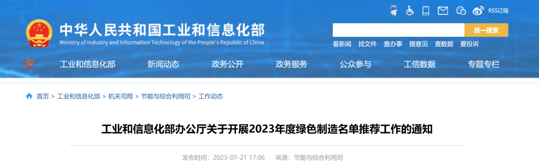 2023年7月21日,工業(yè)和信息化部辦公廳發(fā)布關(guān)于開展2023年度綠色制造名單推薦工作的通知(工信廳節(jié)函〔2023〕202號(hào)),啟動(dòng)2023年度綠色制造名單推薦工作,包括綠色工廠、綠色工業(yè)園區(qū)、綠色供應(yīng)鏈管理企業(yè)。