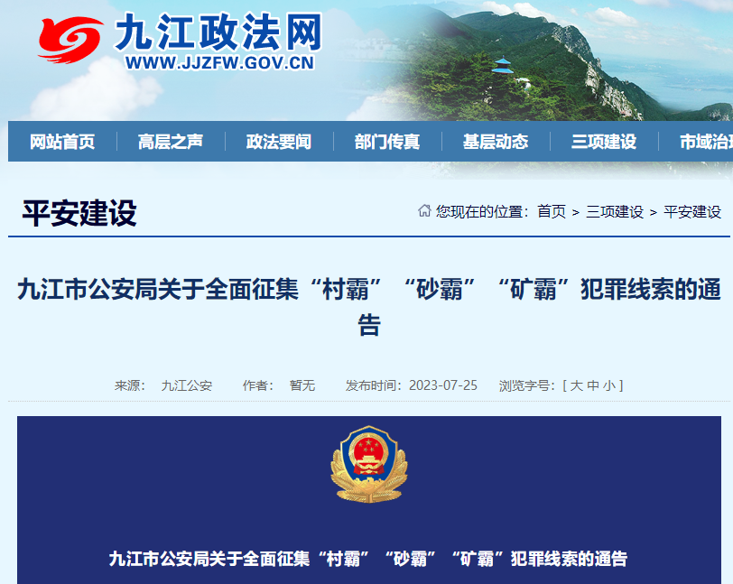 近日,江西九江市公安局發布“全面征集‘村霸’‘砂霸’‘礦霸’犯罪線索的通告”。九江市公安機關決定至2023年底持續開展打擊“村霸”“砂霸”“礦霸”專項行動,歡迎廣大人民群眾積極檢舉揭發涉“村霸”“砂霸”“礦霸”黑惡違法犯罪線索。