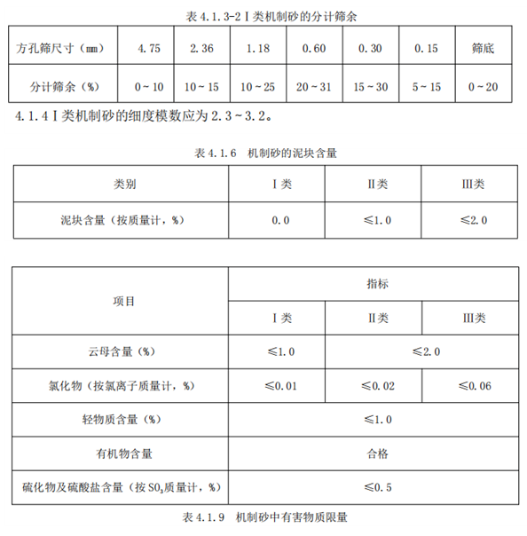 機制砂的粗細程度可按其細度模數(shù)分為粗砂、中砂、細砂,并應符合下列規(guī)定:粗砂:3.7~3.1、中砂:3.0~2.3/細砂:2.2~1.6。