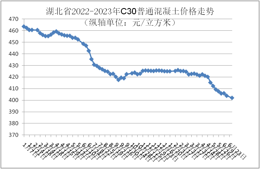 監(jiān)測(cè)數(shù)據(jù)顯示:6月份,強(qiáng)度等級(jí)C30普通混凝土全省均價(jià)為404.52元/立方米,環(huán)比下跌1.62%,同比下跌9.33%。