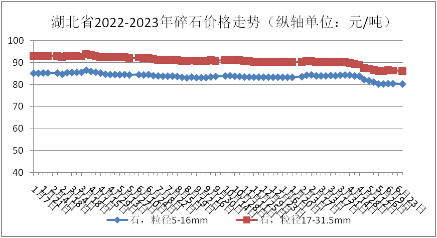 監(jiān)測(cè)數(shù)據(jù)顯示:6月份,碎石(粒徑5-16mm)、碎石(粒徑17-31.5mm)全省均價(jià)分別為80.42元/噸、86.39元/噸,環(huán)比分別下跌:1.25%、0.67%;同比分別下跌:4.91%和6.33%。具體價(jià)格走勢(shì)情況如下圖: