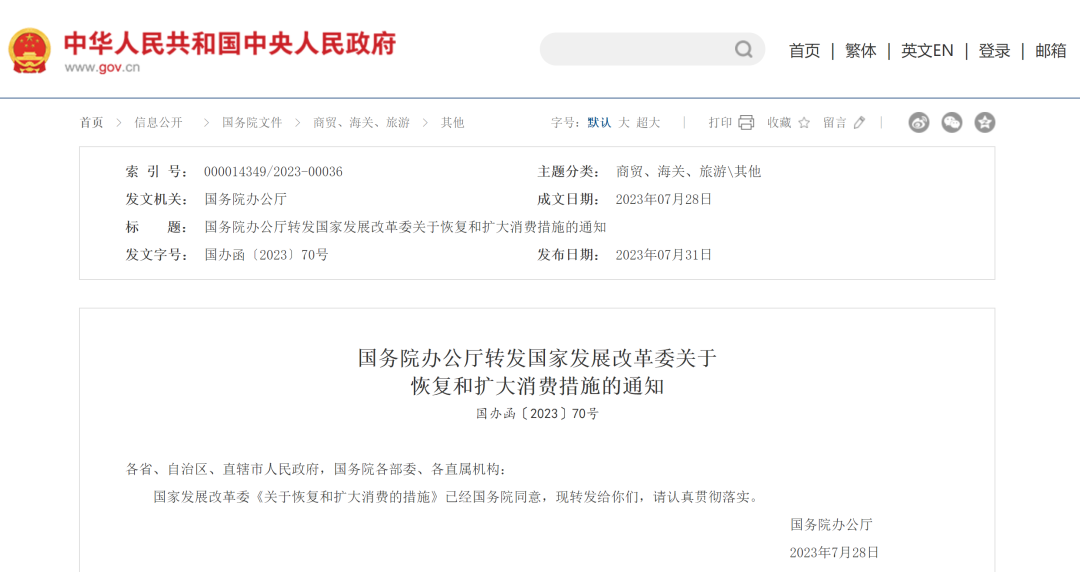 國務(wù)院辦公廳轉(zhuǎn)發(fā)國家發(fā)展改革委關(guān)于恢復(fù)和擴大消費措施的通知