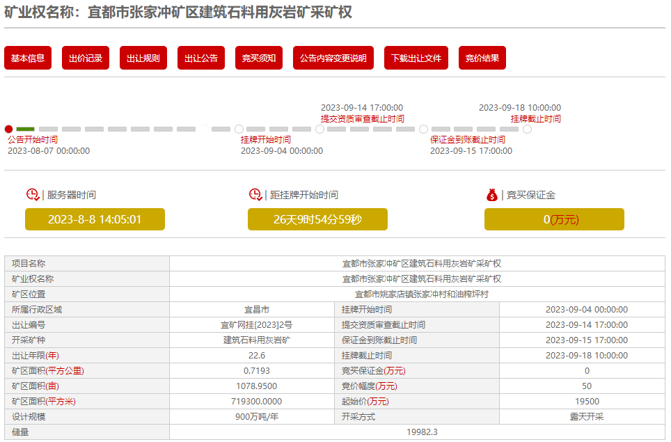 根據《中華人民共和國礦產資源法》、自然資源部《礦業權出讓交易規則》(自然資規〔2023〕1號)要求,經宜都市人民政府批準,宜都市自然資源和規劃局采取網上掛牌方式,公開出讓宜都市張家沖礦區建筑石料用灰巖礦采礦權。現將有關事項公告如下:
