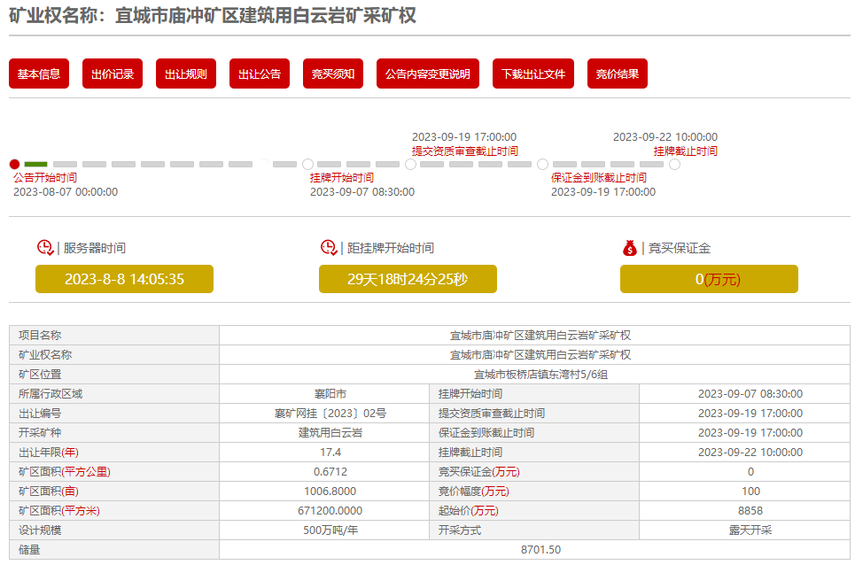 本次采礦權掛牌出讓文件有《宜城市廟沖礦區建筑用白云巖礦采礦權網上掛牌出讓公告》和《宜城市廟沖礦區建筑用白云巖礦采礦權網上掛牌出讓競買須知》及附件。本次采礦權掛牌出讓在湖北省公共資源產權交易網礦業權網上交易系統(http://www.hbggzypm.cn,以下簡稱交易系統)上進行,意向競買人可登錄該系統瀏覽、下載掛牌出讓相關文件。