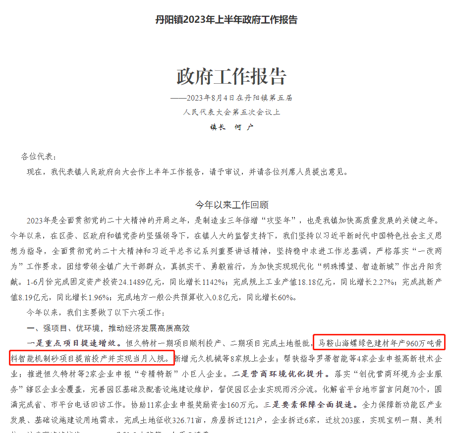 近日,據安徽省馬鞍山市博望區丹陽鎮人民政府《2023年上半年政府工作報告》顯示,馬鞍山海螺綠色建材年產960萬噸骨料智能砂石項目已于今年上半年提前投產并實現當月入規。