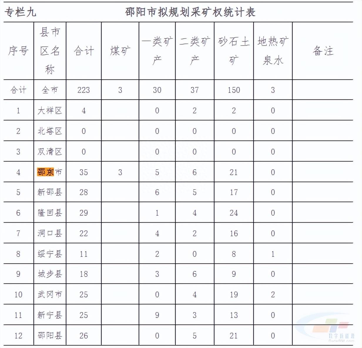 《邵陽市礦產資源總體規劃(2021~2025年)》指出,至2025年規劃期末,邵東市擬規劃35個采礦權,其中煤礦3個,一類礦產5個,二類礦產6個,
