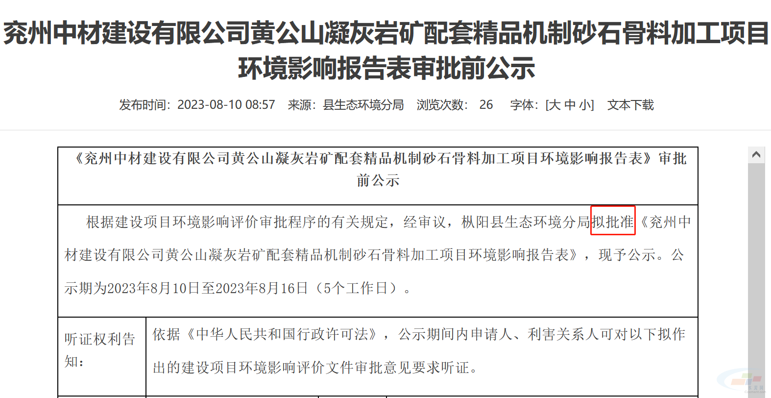 近日,安徽銅陵市樅陽生態環境分局擬批準《兗州中材建設有限公司黃公山凝灰巖礦配套精品機制砂石骨料加工項目環境影響報告表》。