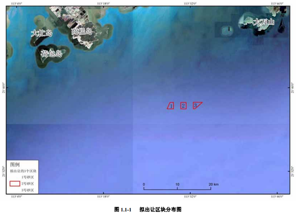 根據規劃,珠海市自然資源局在高欄島東南側約30千米海域設置了3個海砂資源擬出讓區塊,面積總共為8.8平方千米,其中1號砂區面積約為2.8平方千米、2號砂區面積約為3平方千米、3號砂區面積約為3平方千米。