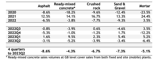 過去一年,數(shù)據(jù)顯示,隨著疫情導(dǎo)致的生產(chǎn)消費抑制的消退以及經(jīng)濟(jì)挑戰(zhàn)浮出水面,建筑礦物產(chǎn)品的需求大幅下降。盡管2021年出現(xiàn)強勁反彈,推動瀝青和碎石銷量達(dá)到十多年來的最高水平,但通脹、利率上升和商業(yè)信心疲軟的影響減緩了新建設(shè)項目的開工速度,導(dǎo)致銷量再次下滑對重型建筑材料的需求。