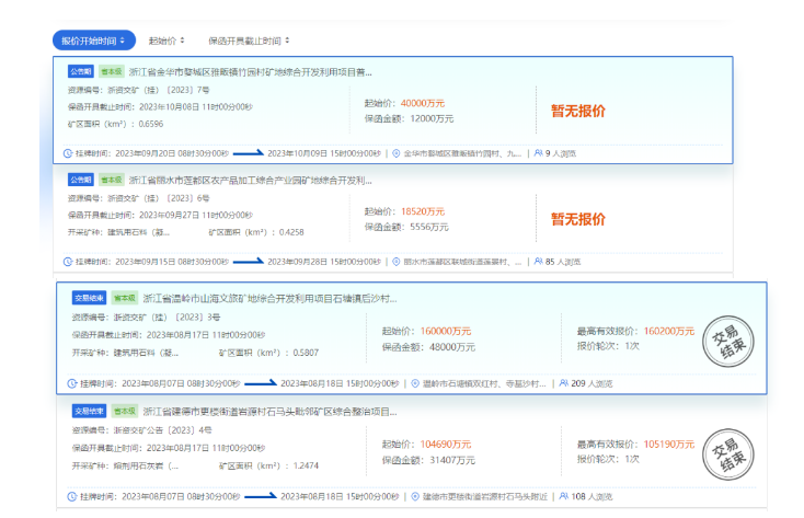 據悉,截至目前浙江2023年成功出讓12宗采礦權(包含本次成交的2宗采礦權)。同時,浙江省當前新成交