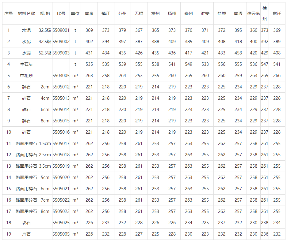 近日,江蘇省交通運輸廳發布2023年7月江蘇省各市交通建設工程主要地材指導價格(含稅價)。(注:政府指導價是由政府價格主管部門或者其他有關部門,按照定價權限和范圍規定基準價及其浮動幅度,指導經營者制定的價格)7月,江蘇省交通建設工程用中粗砂均價260.8元/方,碎石均價223.8元/方,路面用碎石均價258.3元/方。宿遷地區中粗砂價格為各區域最高達到266元/方,徐州地區碎石價格為各區域最高達到237元/方,泰州地區路面碎石價格為各區域最高達到263元/方。