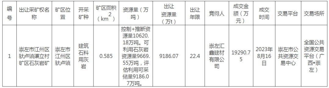 近期,根據廣西崇左江州區人民政府網站發布的崇左市江州區2023年第一期采礦權掛牌出讓結果公示顯示,崇左匯鑫建材有限公司以近2億元競得廣西崇左市江州區馱盧鎮渠立村礦區石灰巖礦。該礦資源總量10620.18萬噸,年開采規模500萬噸,出讓年限22.4年。