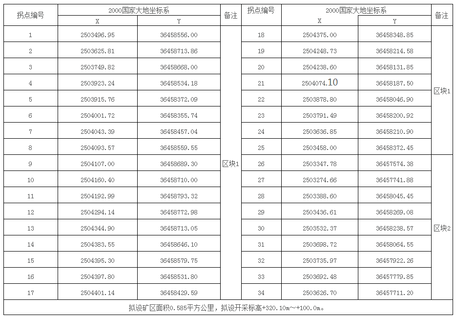 礦區面積及范圍坐標:礦區面積為0.585平方公里,礦區拐點坐標見下表(2000國家大地坐標系):