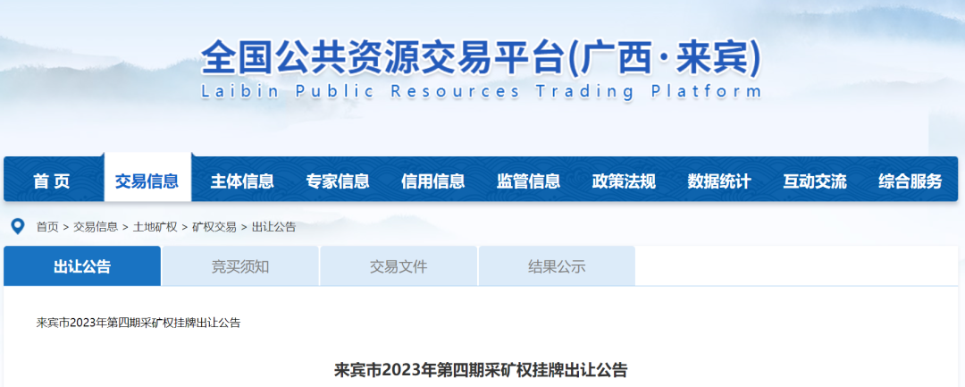 本次掛牌出讓公告同時在中華人民共和國自然資源部網站(http://www.mnr.gov.cn/ )、來賓市人民政府網站(http://www.laibin.gov.cn/)、來賓自然資源局網站(http://lb.dnr.gxzf.gov.cn/)、全國公共資源交易平臺(廣西?來賓)(http://ggzy.jgswj.gxzf.gov.cn/lbggzy)發布。