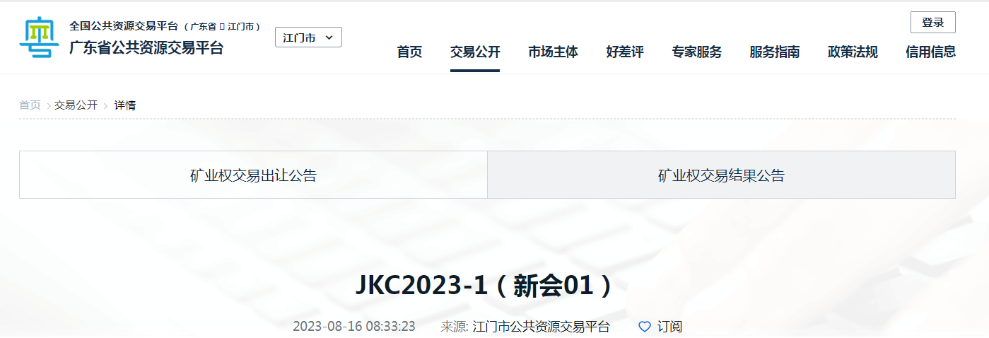 受江門市新會區自然資源局委托,江門市公共資源交易中心新會分中心將以網上掛牌方式出讓JKC2023-1(新會01)號采礦權,現就有關事項公告如下: