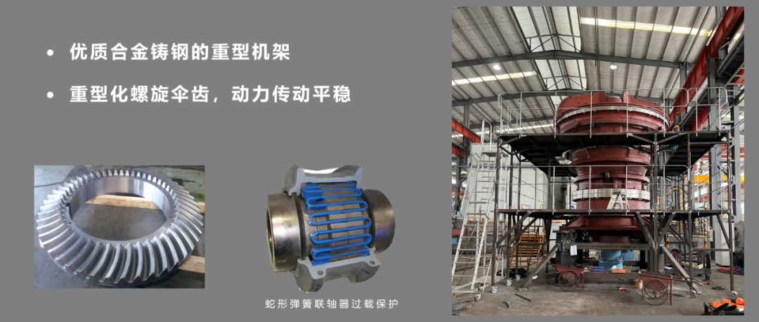 襯板保護(hù)橫梁鑄件;錐面配合、壓裝入上架體,均衡負(fù)載;強(qiáng)度大、受力均勻、破碎力(沖擊載荷)360°均分。同時(shí),橫梁護(hù)板及橫梁臂的襯板均為螺栓固定,方便更換,減少停機(jī)時(shí)間。