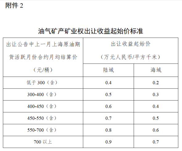 二、油氣礦產礦業權出讓收益起始價標準按附件2執行。