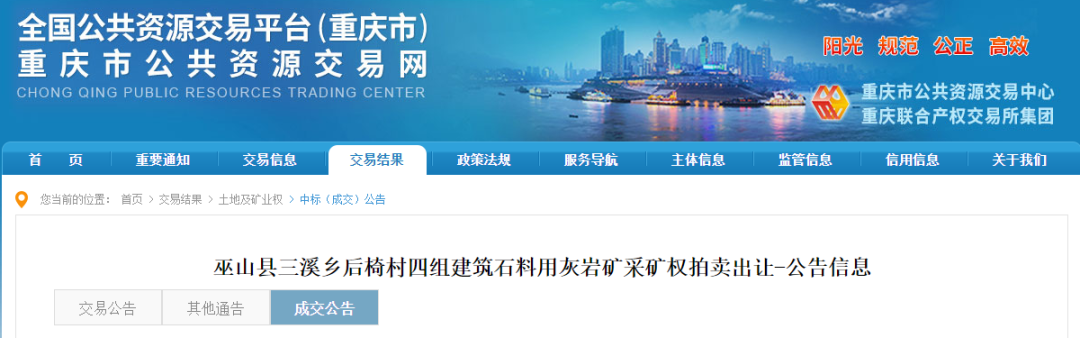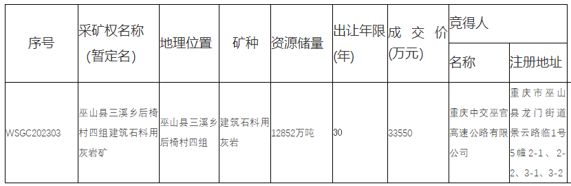 巫山縣三溪鄉后椅村四組建筑石料用灰巖礦采礦權出讓成交結果公示根據 《礦業權交易規則》、《探礦權采礦權招標拍賣掛牌出讓管理暫行辦法(試行)》等有關規定,2023年8月11日在巫山縣公共資源交易中心成功拍賣出讓1宗采礦權,現將交易結果公示如下: